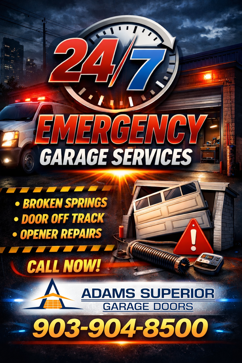 Adams Superior Garage Doors provides 24/7 emergency garage door services. Contact us today if your garage door is broken and in need of emergency repairs to get it working again. Our fast and professional technicians will be able to assist you courteously and in a timely manner.